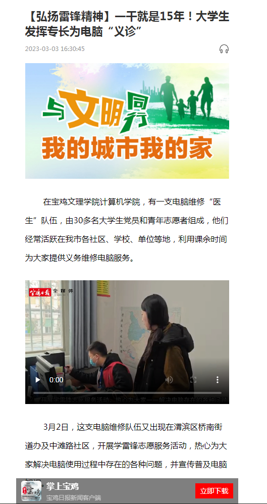 3月3日,《宝鸡日报》报道了公司“护脑护芯”志愿者赴渭滨区桥南街道办及中滩路社区开展学雷锋志愿服务活动情况。公司志愿者热心为大家解决电脑使用过程中存在的各种问题,并宣传普及电脑知识。